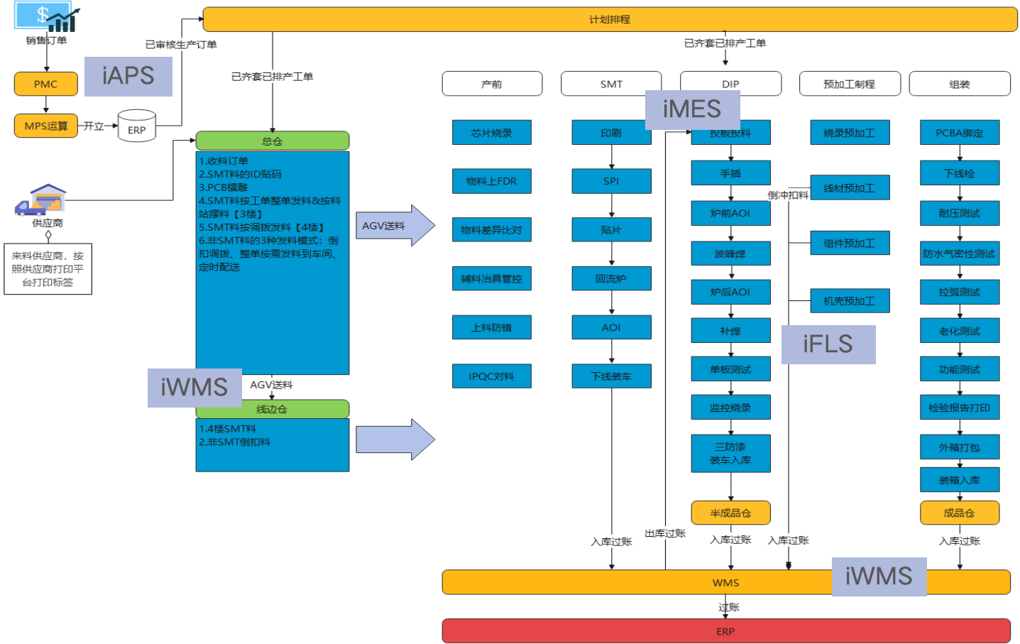 涵盖软硬件:iAPS、iWMS、iMES、iFLS、全自动贴标设备、智能料架、智能锡膏柜、X-RAY。