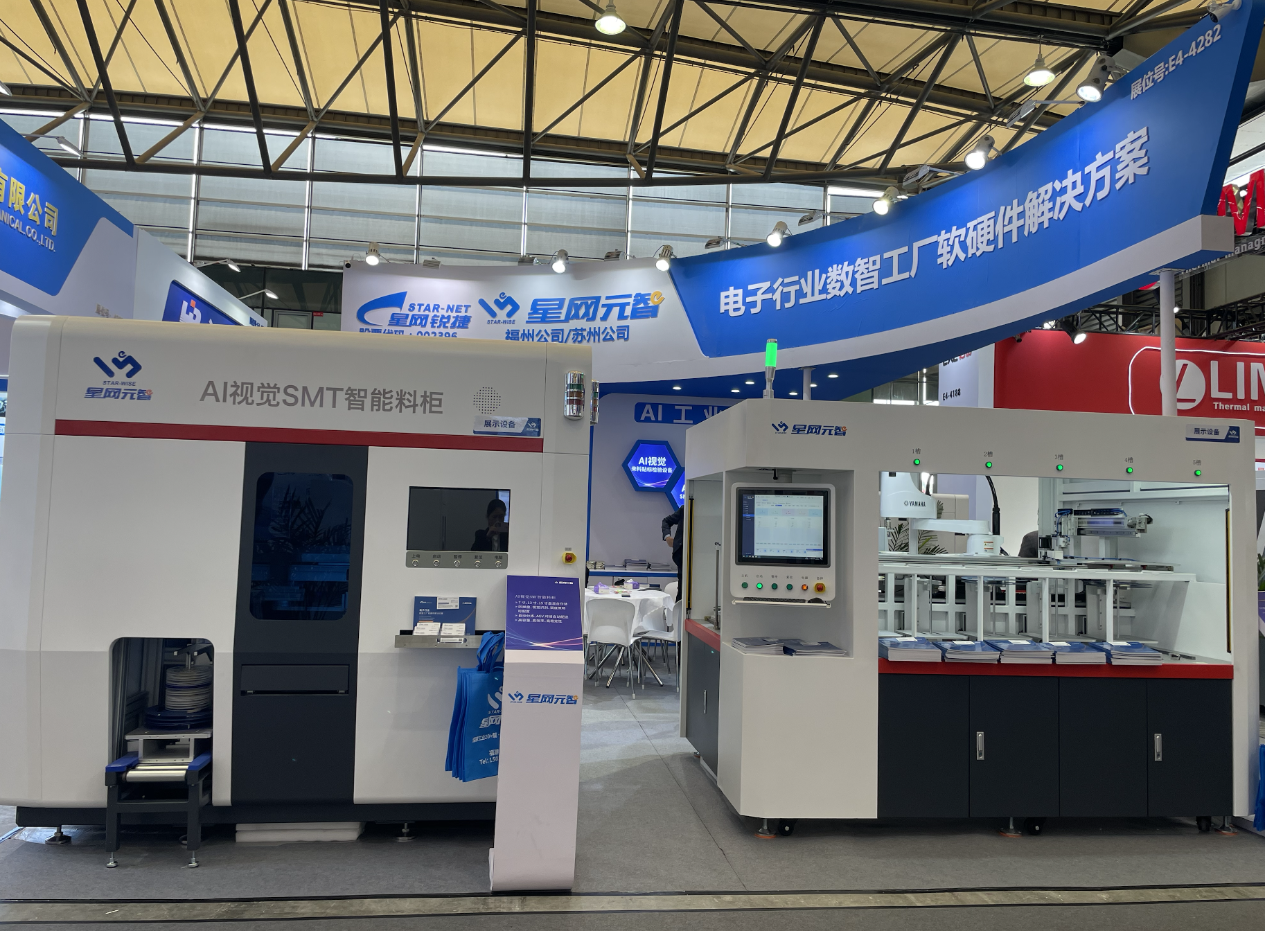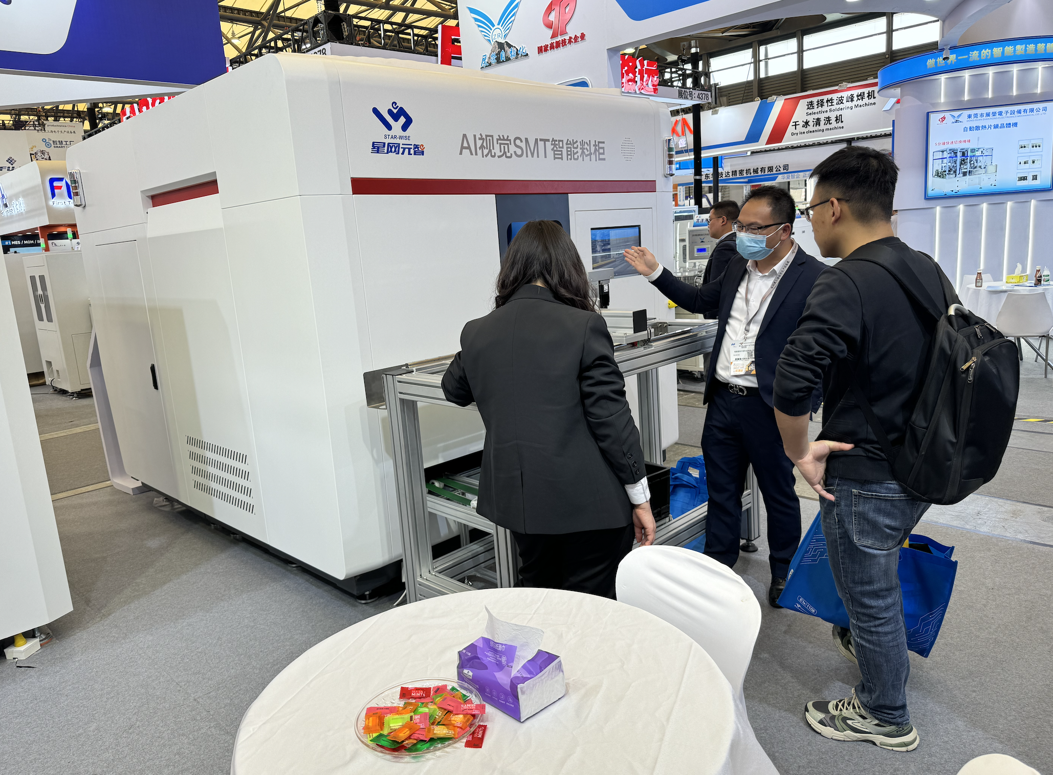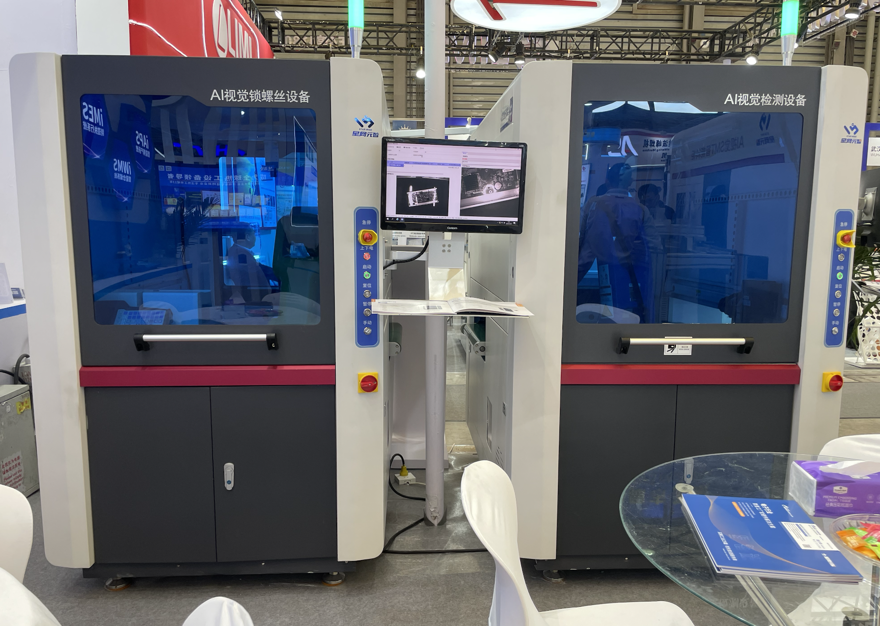 本次展会,星网元智带来了4台基于AI视觉的自动化设备:AI视觉全自动来料贴标检验设备、AI视觉SMT智能料柜、AI视觉装配锁附设备、AI视觉检测设备。我们的设备颜值与实力,高颜值的外表下,是基于AI视觉技术,结合对行业、场景的理解,真正从客户需求的角度出发,解决实际问题,提高生产效率和品质,实现柔性制造。