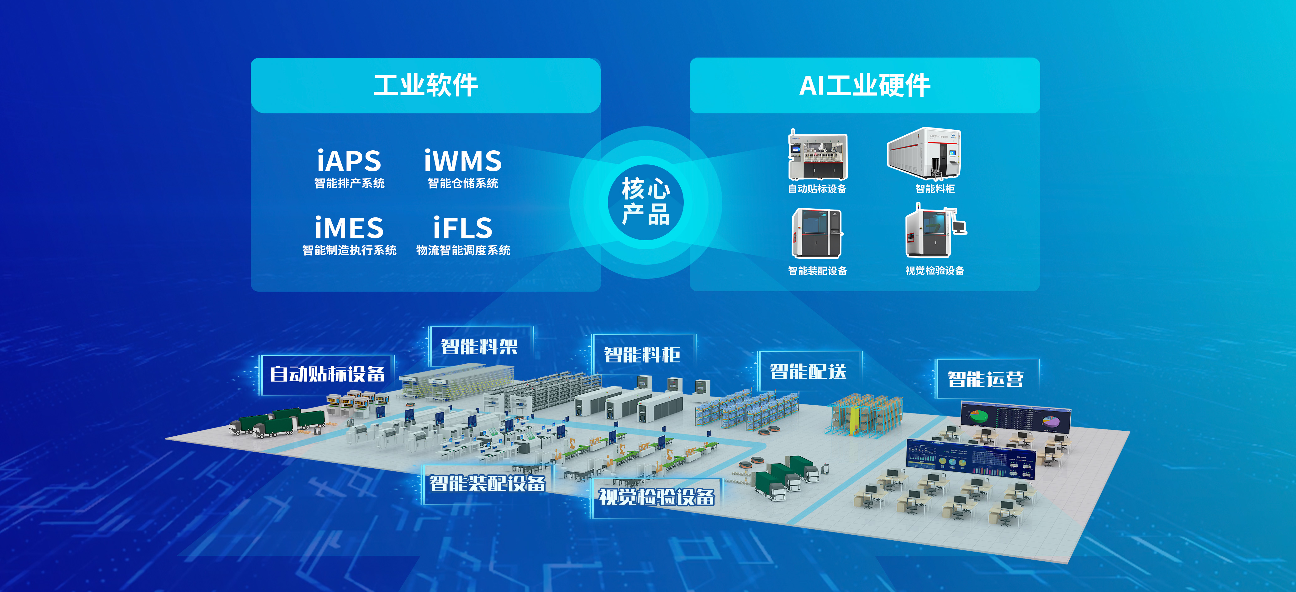 解决方案覆盖电子制造企业排产、仓储、车间、厂内物流、智能装配生产等生产制造全流程,包含智能工厂规划、工业软件、AI工业硬件的智能化整体软硬件解决方案,帮助企业实现降本增效、支撑企业高质量发展。