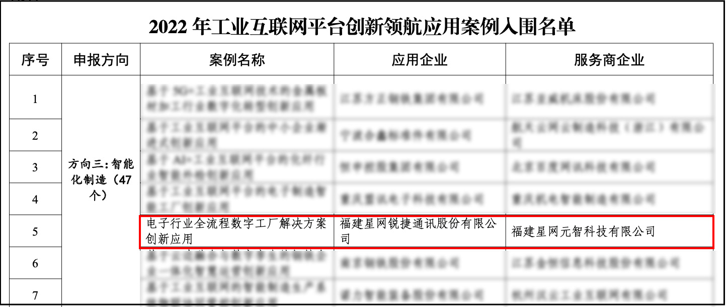 近日,工信部公示了2022年工业互联网平台创新领航应用案例名单,星网元智“电子行业全流程数字工厂解决方案创新应用”案例成功入选!