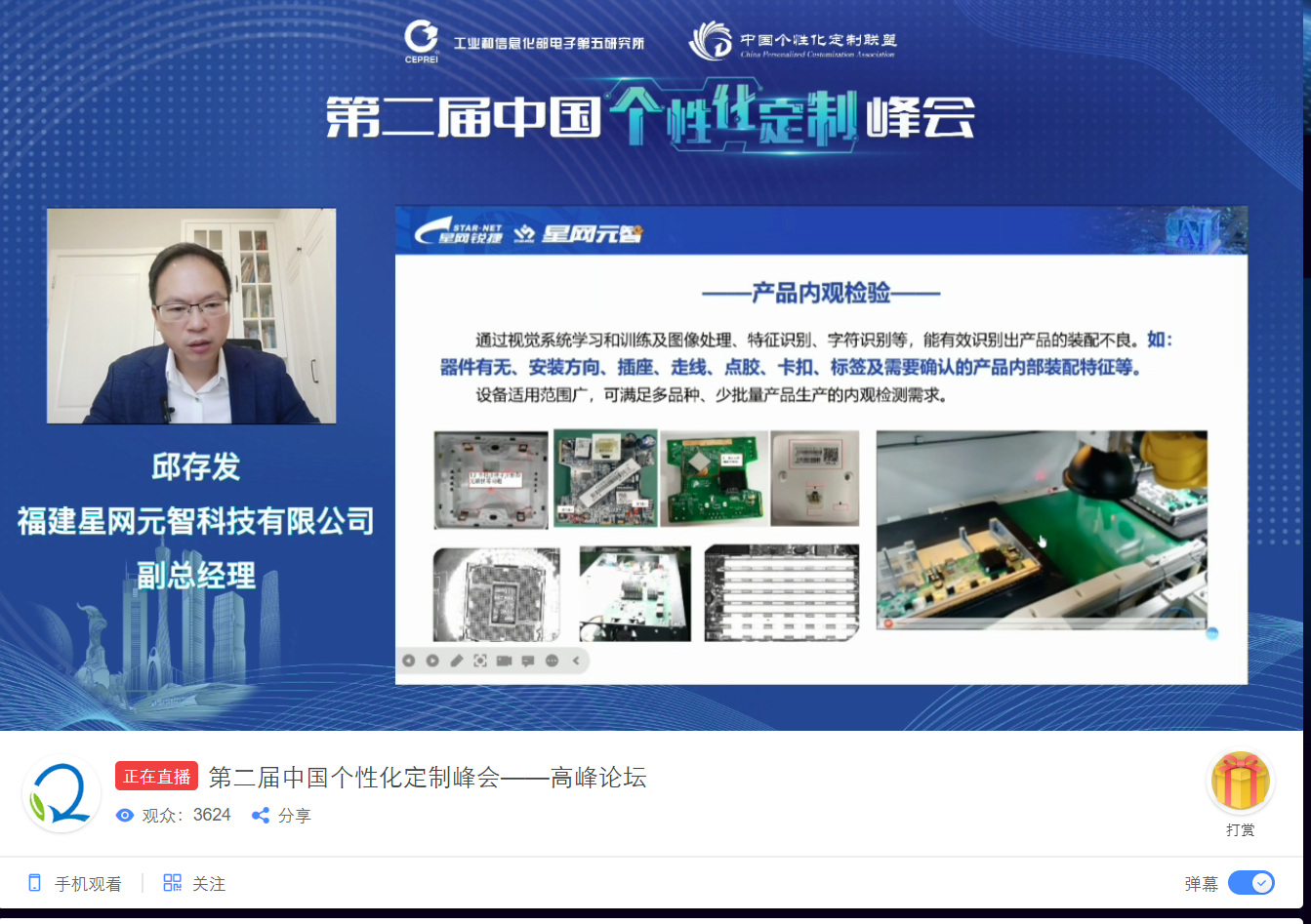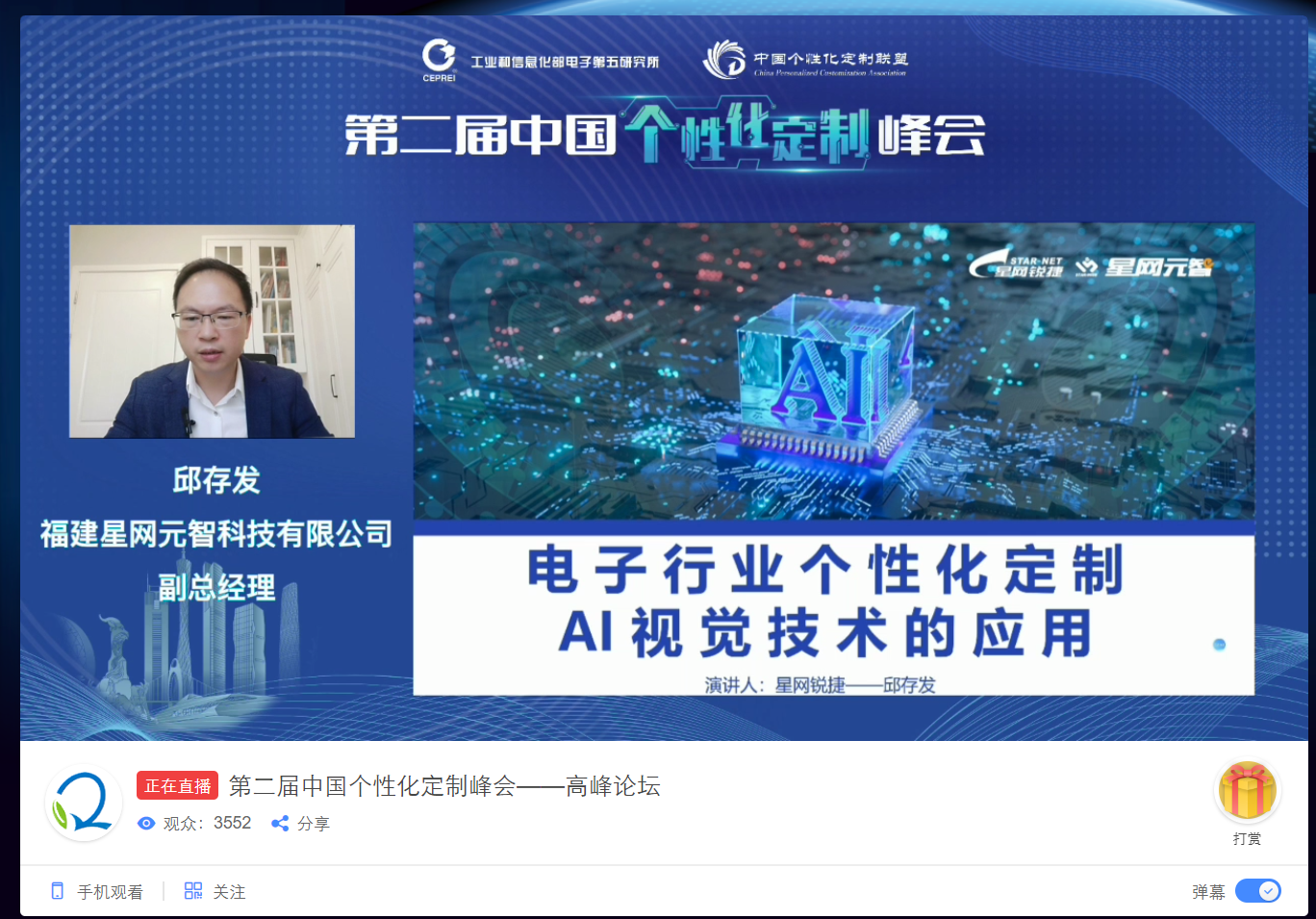 2022年12月,第二届中国个性化定制峰会通过线上直播模式开展,星网元智副总经理邱存发先生受邀参会,并发表“电子行业个性化定制-AI视觉技术的应用”的主题演讲,直播期间,吸引了超3000人在线观看。