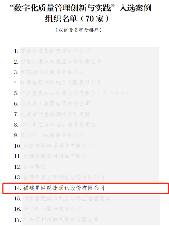 近日,中国质量报刊社公布了数字化质量管理创新与实践案例名单,星网元智实施的“星网锐捷全流程数智工厂建设”案例成功入选!