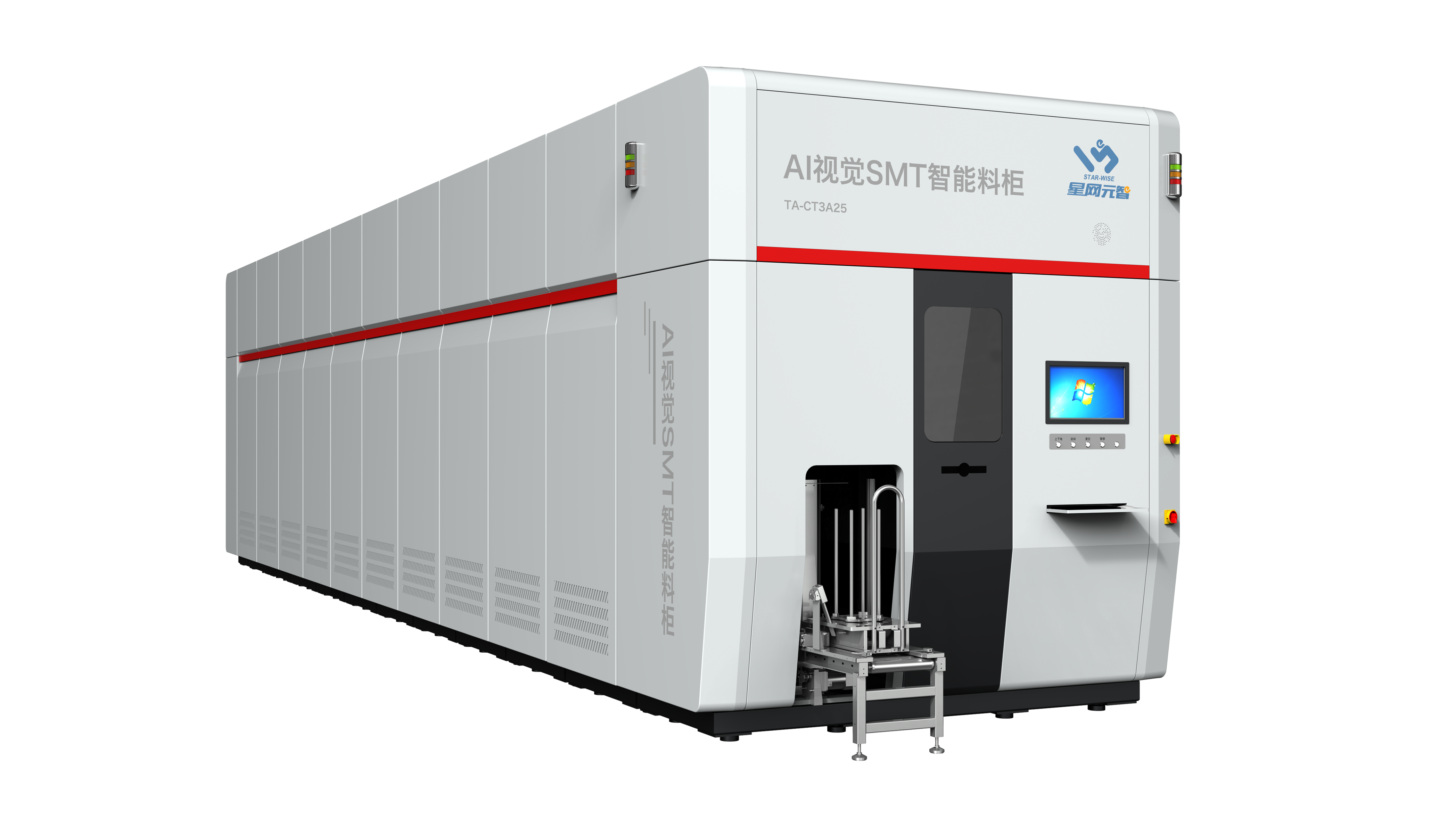 星网元智自主研发的“AI视觉SMT智能料柜”,用于SMT物料的高密度储存、自动入库和发料。料柜采用新型专利设计,利用AI视觉技术及特有策略算法,规避了市面上已有智能料柜存在的掉盘、卡盘等问题,具有高容量、高效率、高稳定性等特点。料柜可根据使用环境、物料业务数据等进行不同规格定制,并且可集成仓储管理系统(WMS),支持成套发料或者JIT发料等备料模式。