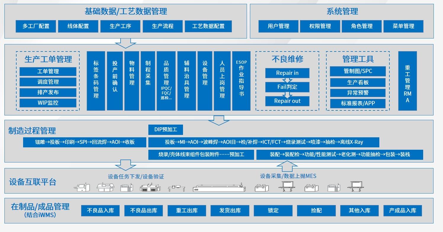 计划调度、标签管理、工艺管理、流程管理、进度管理、质量管控、设备管理、人员管理、预警管理、防呆防错、追溯管理、可视化看板。