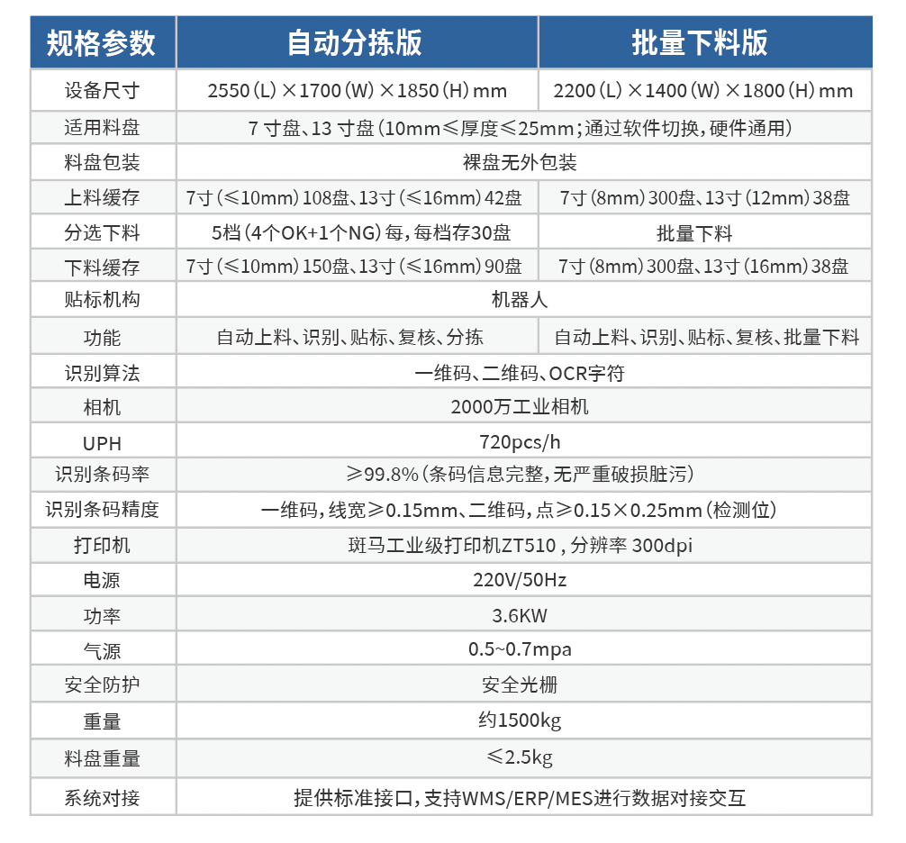 SMD全自动贴标机可实现全自动料盘贴标检验作业:通过视觉识别料盘的条码信息并上传到客户端系统,自动生成新的二维码(一维码)标签,自动识别料盘空白位置,引导贴标模组进行贴标,代替人工为料盘贴标签的工作。同时对料盘各种关键参数进行比对,代替IQC的人工检验工作。有自动分选版、批量上下料版、分拣装盒版三个版本。